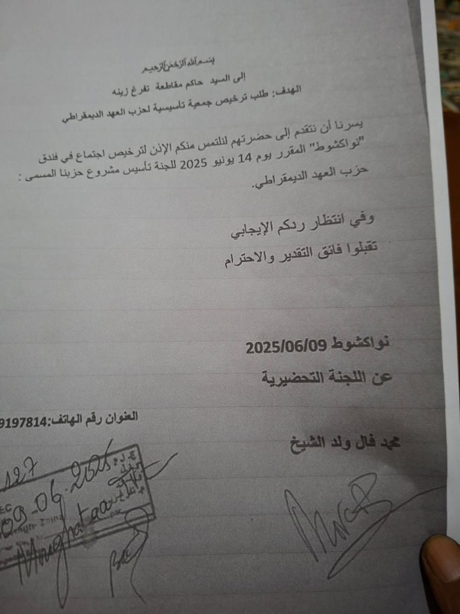 وفي اليوم الموالي: يوم الاثنين الموافق 09/06/2025، تقدمنا بصيغة طلب لحاكم مقاطعة تفرغ زينه وفق ما تنص عليه الإجراءات، طلبا لترخيص الاجتماع التأسيسي، محددين الزمان والمكان، وفي اليوم الموالي 10/06/2025, تلقينا إشعارا من الحاكم بقبول طلبنا، مع التأكيد على التزامنا بمسطرة القوانين والإجراءات المنصوص عليها فيما يتعلق بالأحزاب.