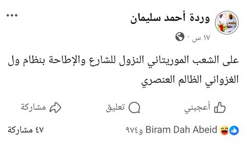 ووصفت الناشطة في تدوينتها نظام الرئيس محمد ولد الغزواني بـ"الظالم والعنصري" على حد تعبيرها.