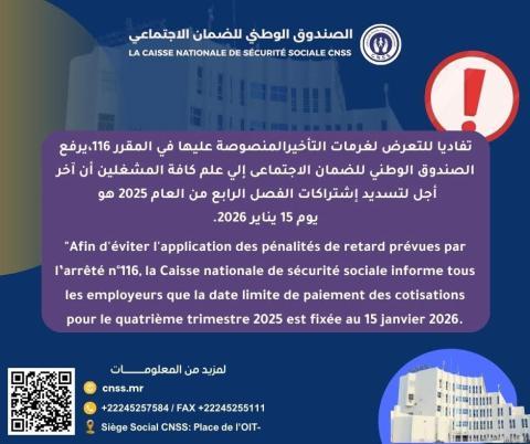 بنشاب : أعلن الصندوق الوطني للضمان الاجتماعي أنه، تفادياً لتطبيق غرامات التأخير المنصوص عليها في المقرر رقم 116، فإن آخر أجل لتسديد اشتراكات الفصل الرابع من سنة 2025 هو يوم 15 يناير 2026.
