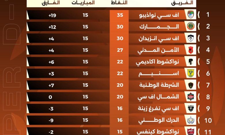 يعتلي أفسي نواذيبو الصدارة برصيد 35 نقطة وفارق أهداف قوي (+19)، بعد خوضه 15 مباراة، ليؤكد مرة أخرى استقراره الفني وقدرته على حسم المباريات الكبرى، واضعًا نفسه مرشحًا أول للحفاظ على اللقب.