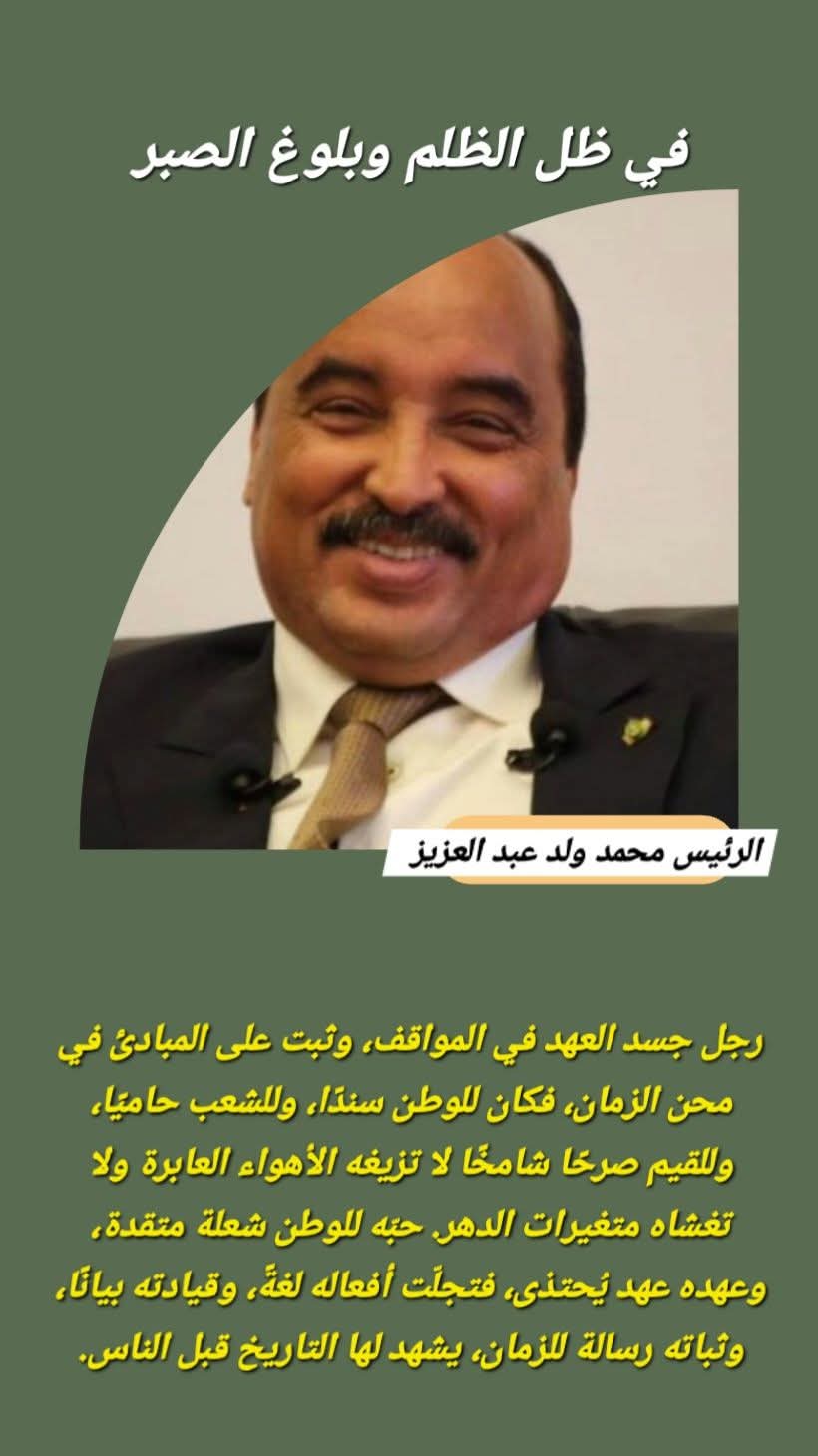 لقد تعرّض الرئيس السابق محمد ولد عبد العزيز الشهم البطل لموجات من الظلم، واستُهدف في قواطع القرار وفي أروقة الحق، غير أن الصبر كان درعه واليقين سلاحه، فلا عزّ يزول مع الرياح العابرة، ولا حقيقة تنطفئ مع صخب الأعداء. ومع كل محاولةٍ لتقويضه، ظل اسمه يشعُّ في الأذهان كرمزٍ للثبات والشجاعة، مؤكدًا أن الحق يبقى أقوى من كل مؤامرة.