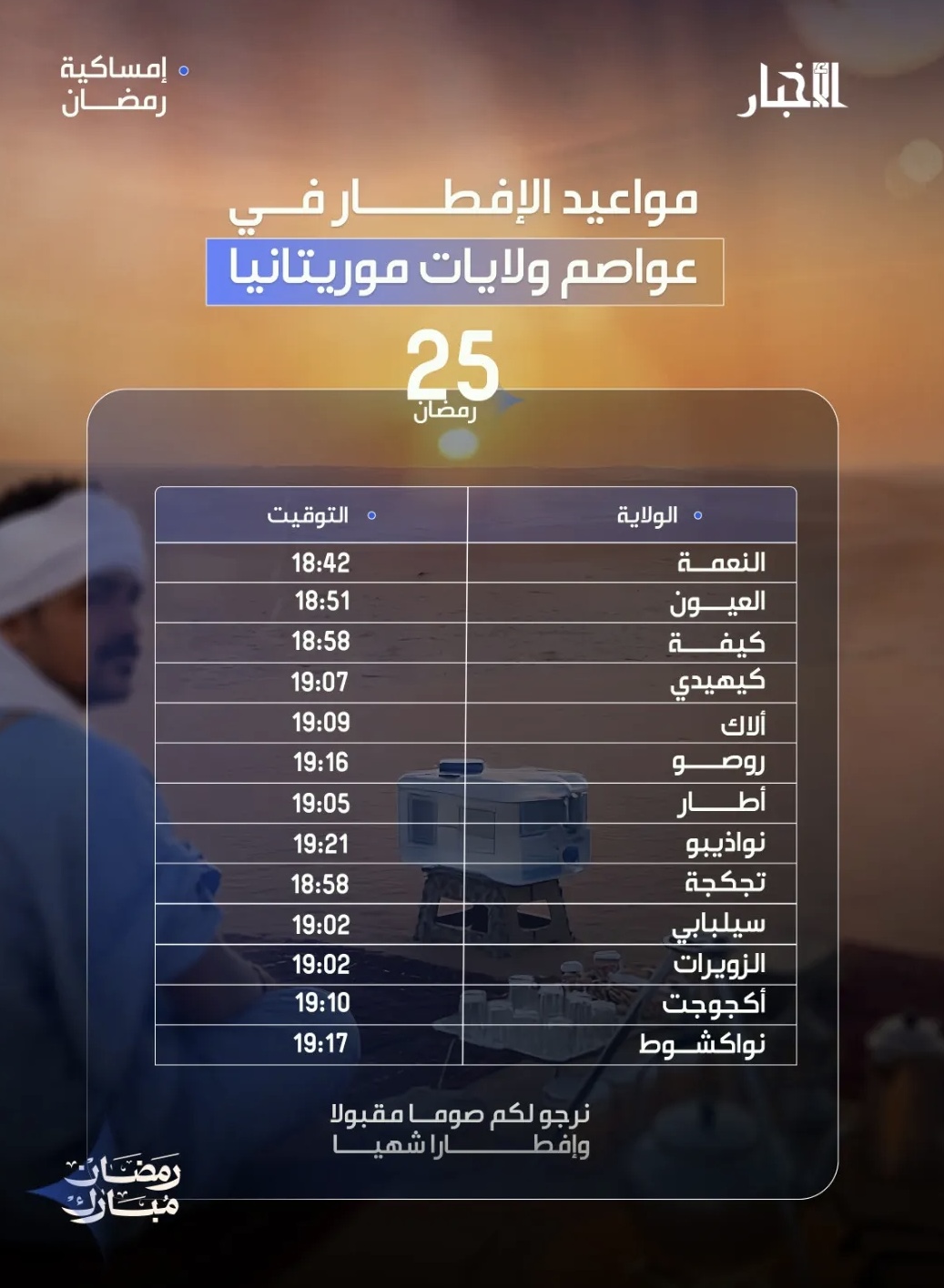 وهذه أوقات الإفطار في عواصم ولايات موريتانيا بالنسبة لليوم الـ25 من شهر رمضان 1447 ه.