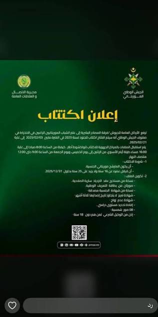 بنشاب : فتحت الأركان العامة للجيوش باب الانضمام إلى الجيش الوطني، عبر إعلان جديد صادر عن فرقة المصادر البشرية، يستهدف الشباب الموريتانيين الراغبين في الالتحاق بالمؤسسة العسكرية.