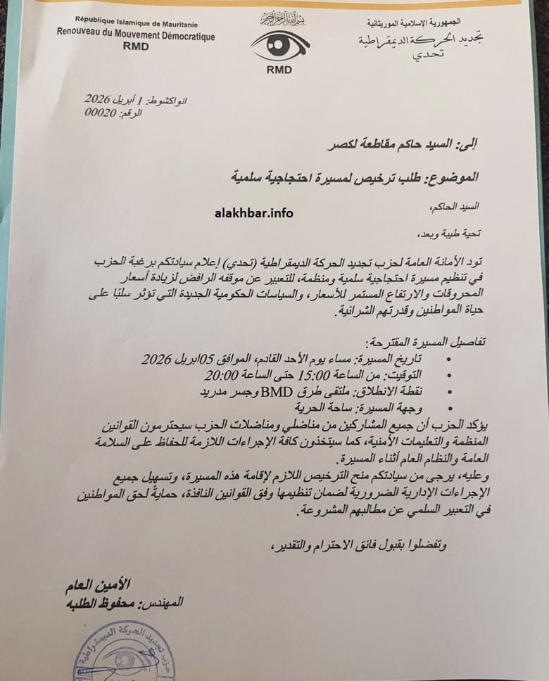 وأودع الحزب إشعارا بالمسيرة، وطلبا لترخيصها اليوم لدى حاكمي مقاطعتي لكصر وتفرغ زينة في ولاية نواكشوط الغربية.