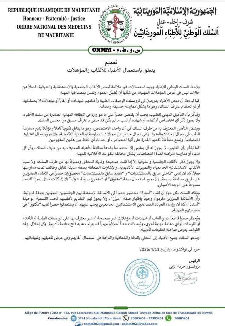 بنشاب : دعا السلك الوطني للأطباء الموريتانيين جميع الأطباء إلى التحلي بالدقة والشفافية والنزاهة في استعمال ألقابهم وفي عرض تأهيلهم وشهاداتهم.