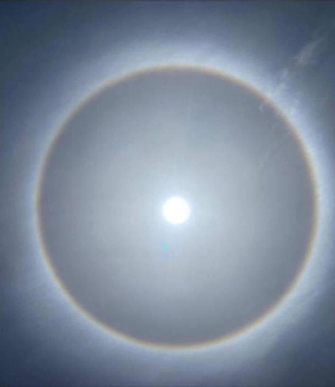 وبيّنت الهيئة أن هذه الظاهرة، المعروفة بـ"الهالة الجوية"، تظهر عادة على شكل دائرة أو قوس يحيط بالشمس.