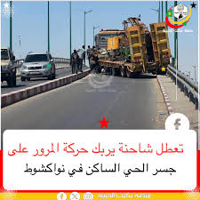 تسبب تعطل شاحنة ثقيلة، اليوم الثلاثاء، أعلى جسر الحي الساكن في نواكشوط، في إرباك حركة المرور وإبطاء انسيابيتها بشكل ملحوظ.
