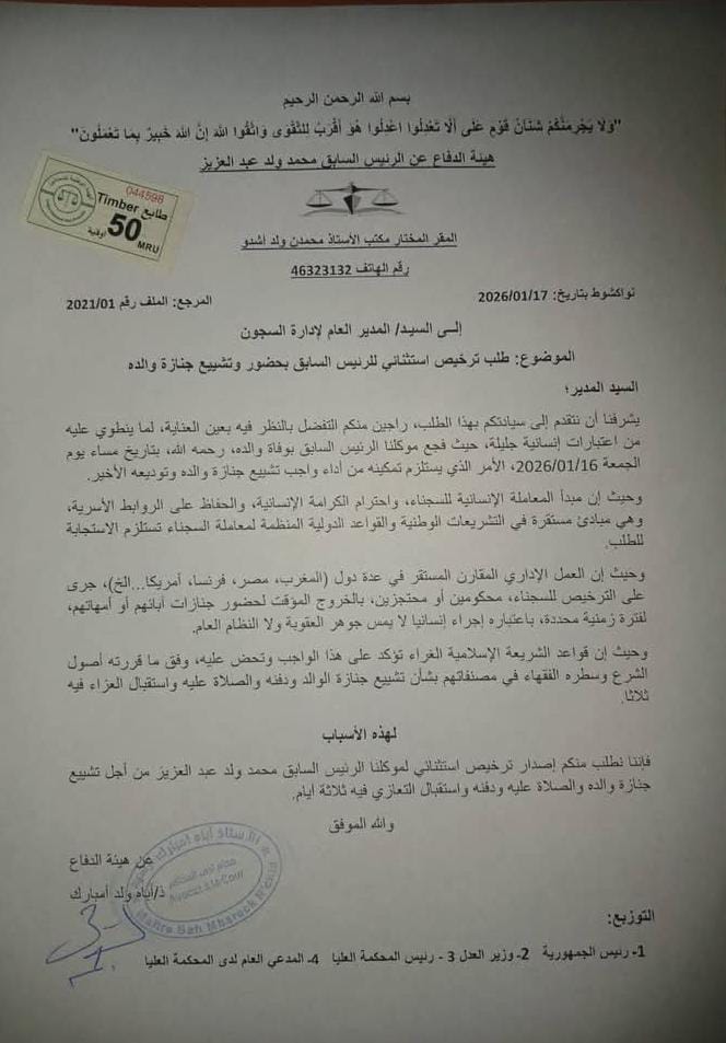 لقد تمت الاستجابة لطلب دفاع الرئيس محمد ول عبدالعزيز، لكن بشروط قاسية وباردة، لا تُراعي ثِقَل اللحظة ولا هشاشة الوداع.