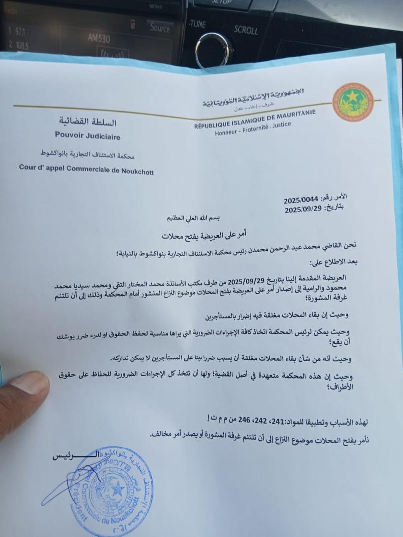 بنشاب : أمر رئيسُ محكمة الاستئناف التجارية بنواكشوط بالنيابة القاضي محمد عبد الرحمن محمدن بفتح محلات تجارية موضوع نزاع في سوق السبخة المركزي.