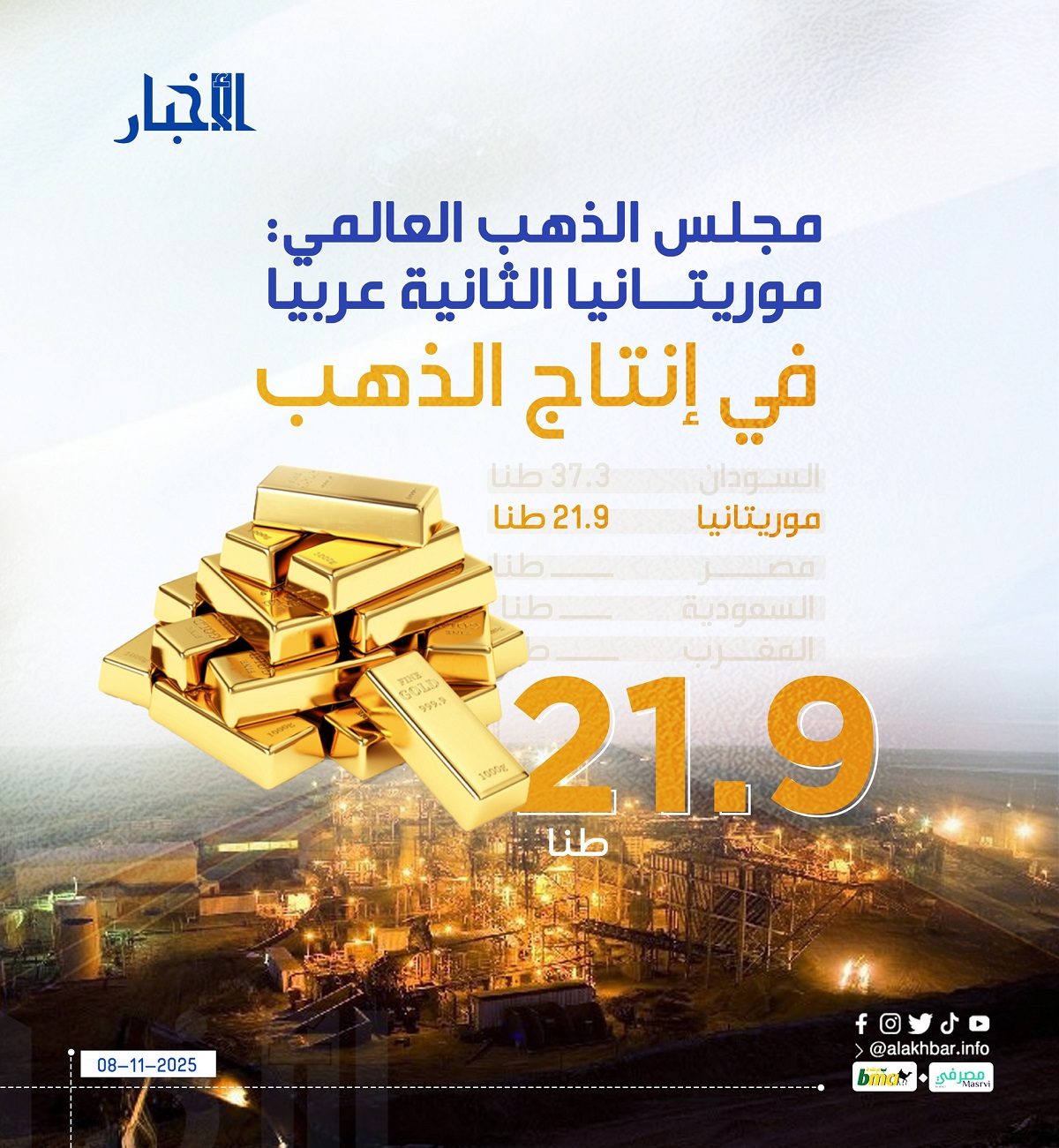 بنشاب : كشف تقرير صادر عن مجلس الذهب العالمي حلول موريتانيا في الرتبة الثانية عربيا في مجال إنتاج الذهب، بإنتاجها لـ21.9 طنا من الذهب خلال العام المنصرم.