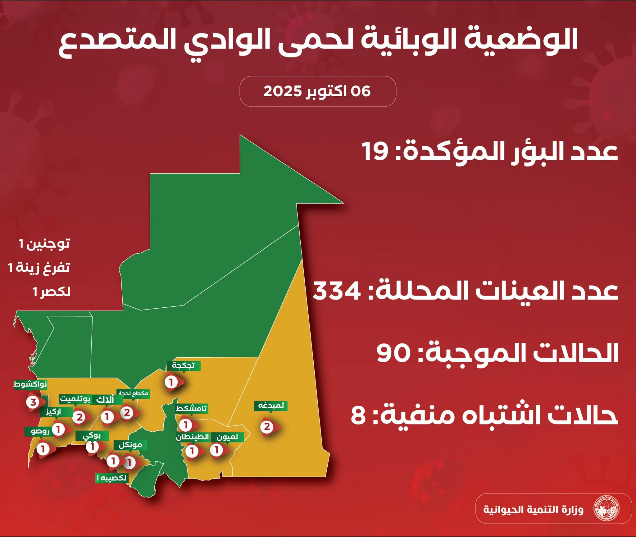 بنشاب : كشفت وزارة التنمية الحيوانية، اليوم الأربعاء، ارتفاع عدد بؤر حمى الوادي المتصدع في موريتانيا إلى 26 بؤرة، بعد الكشف عن سبع بؤر جديدة خلال الأربع والعشرين ساعة الأخيرة.