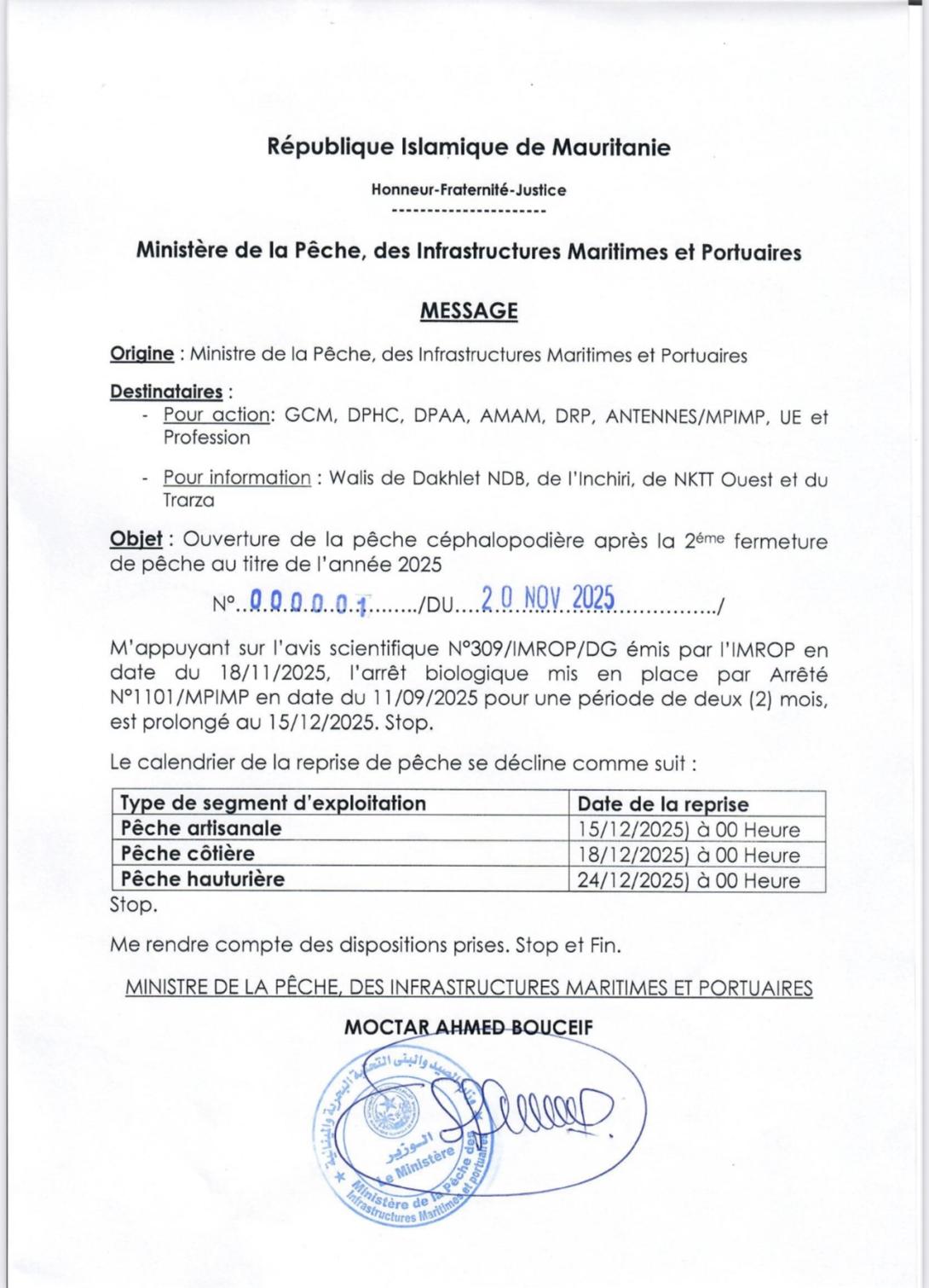 بنشاب : أصدرت وزارة الصيد والاقتصاد البحري مؤخرا تعميما بموجبه حددت فترة التوقف البيولوجي لمختلف انواع الصيد البحري ،ورغم ان الوثيقة حددت يوم 20 ابريل اي 10 ايام قبل التوقف الطبيعي للصيد الصناعي ،الا أن الوزارة منحت السفن الحق في مواصلة الصيد بعد ذلك التاريخ ، وهو ما يضفي نوعا من عدم المصداقية على تلك الوثيقة ،كما يعتبر عدم اكتراث بتوصية معهد بحوث