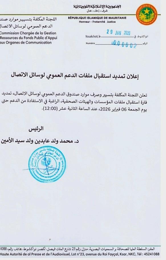 بنشاب : أعلنت لجنة تسيير وصرف موارد صندوق الدعم العمومي لوسائل الاتصال عن تمديد استقبال ملفات المؤسسات والهيئات الصحفية الراغبة في الحصول على الدعم العمومي للسنة 2025 إلى غاية الجمعة المقبل عند منتصف النهار.