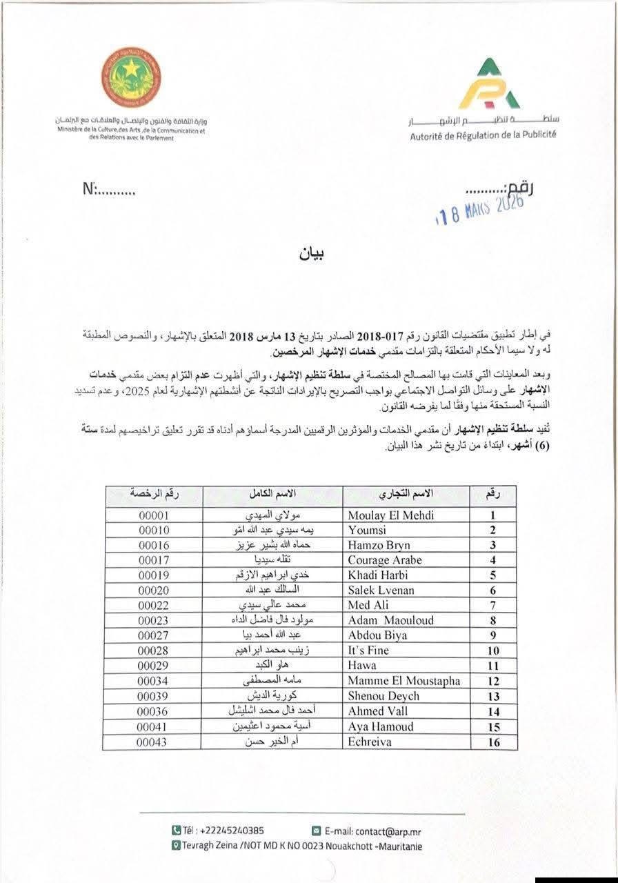 بنشاب : أعلنت سلطة تنظيم الإشهار تعليق تراخيص 35 من مقدمي خدمات الإشهار من صانعي المحتوى بمواقع التواصل الاجتماعي بموريتانيا لمدة ستة أشهر.