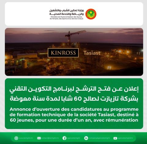 بنشاب : أعلنت الإدارة العامة للتشغيل بوزارة تمكين الشباب والتشغيل والرياضة والخدمة المدنية، بالتعاون مع شركة كينروس تازيازت موريتانيا، عن فتح باب الترشح للاستفادة من برنامج التكوين التقني بشركة تازيازت.