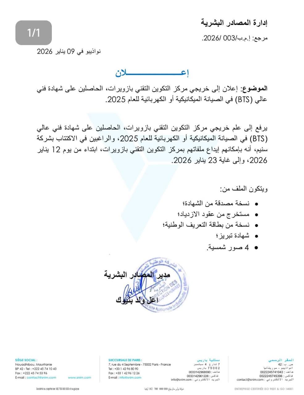 بنشاب : أعلنت إدارة المصادر البشرية في الشركة الوطنية للصناعة والمناجم "سنيم" عن فتح باب الترشح للاكتتاب أمام خريجي مركز التكوين التقني بالزويرات.