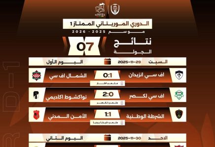 بنشاب : شهدت الجولة السابعة من الدوري الموريتاني لكرة القدم استمرار المنافسة المتقاربة بين أندية المقدمة والوسط، حيث فرض التعادل الإيجابي نفسه على مواجهة كينغ نواكشوط وإنتر نواكشوط بهدف لمثله على أرضية ملعب شيخا بيديا، وبادر إنتر نواكشوط بالتسجيل عبر ماما صو، قبل أن يعادل إسماعيل العبد النتيجة لصالح كينغ نواكشوط، ليرفع الفريقان رصيديهما إلى سبع نقاط