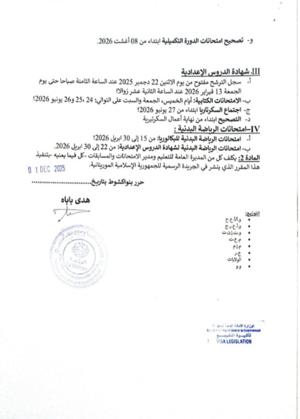 بنشاب: وقعت وزيرة التربية وإصلاح النظام التعليمي هدى بنت باباه مقررا يحدد تواريخ الامتحانات والمسابقات الوطنية للسنة الدراسة 2025 – 2026، وحددت لها الفترة من 22 يونيو إلى 02 يوليو 2026.