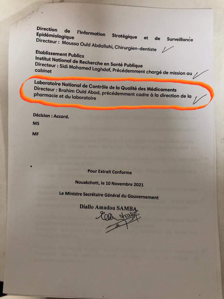 الوثيقة الرسمية لتعيين الدكتور إبراهيم ولد عباد مرفقة مع التدوينة