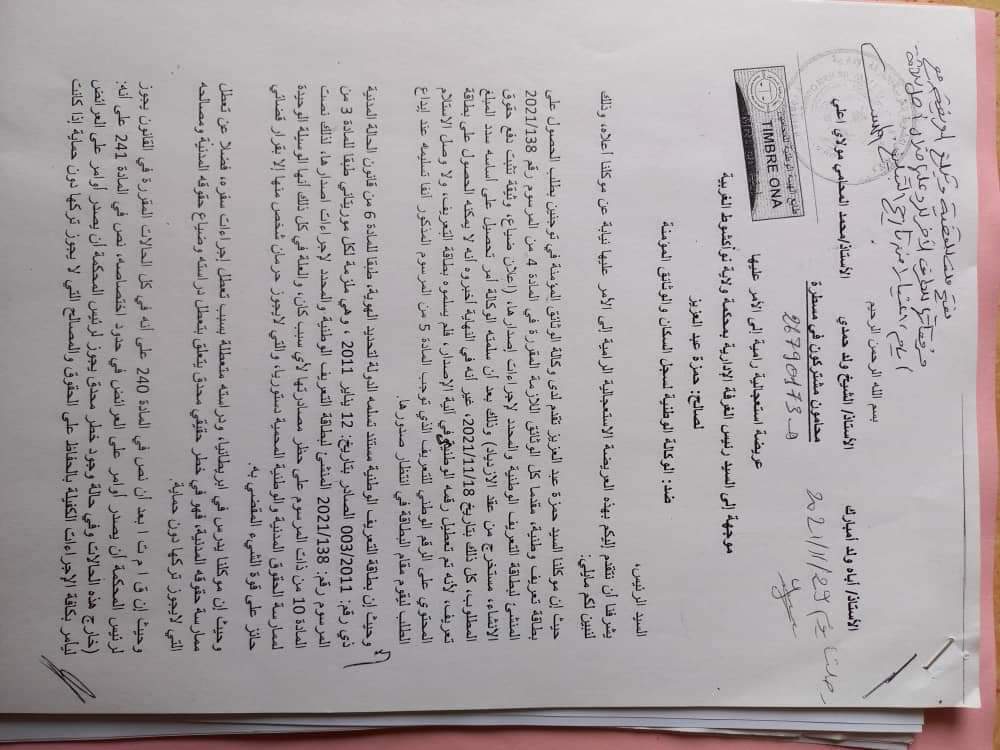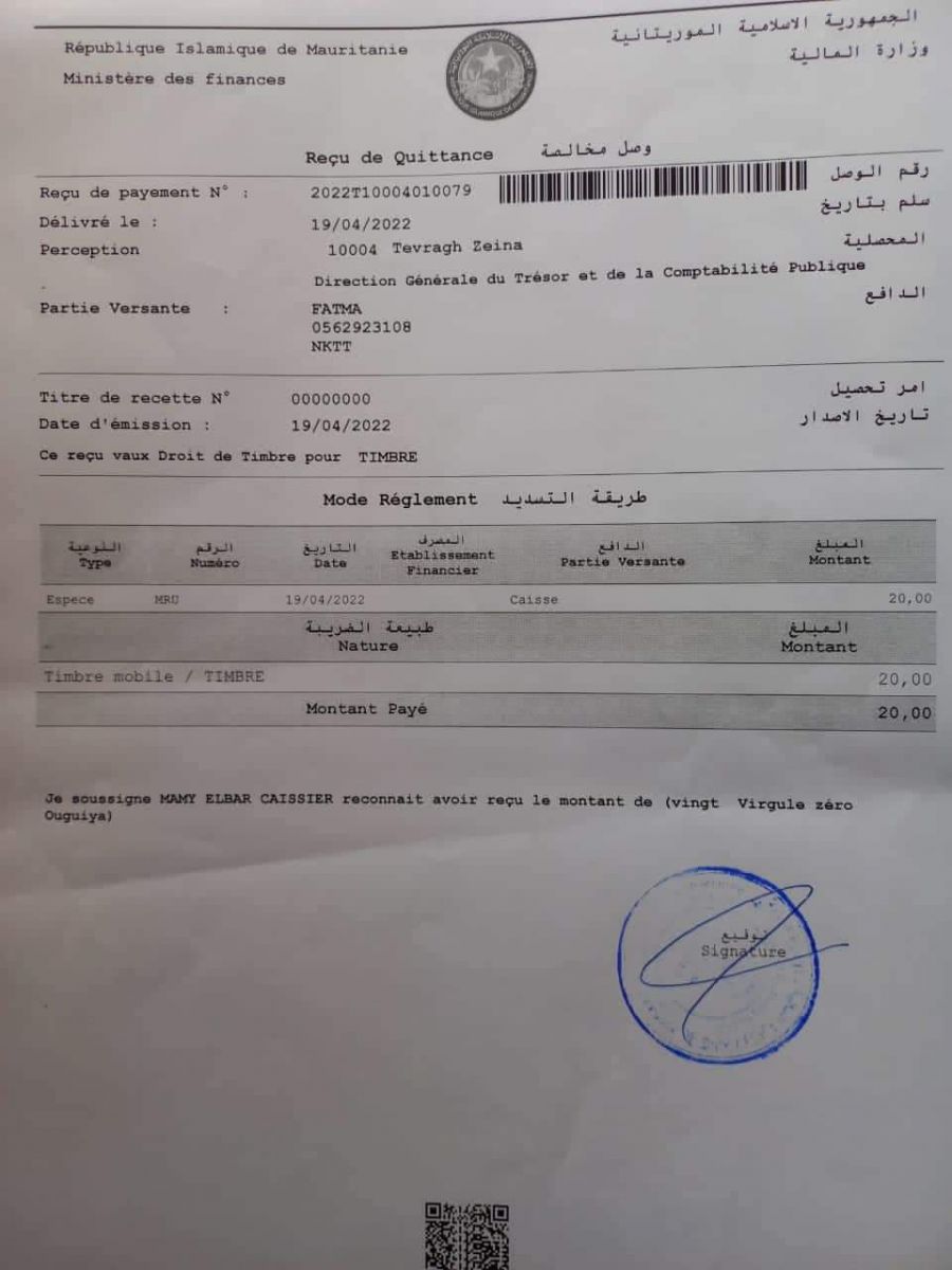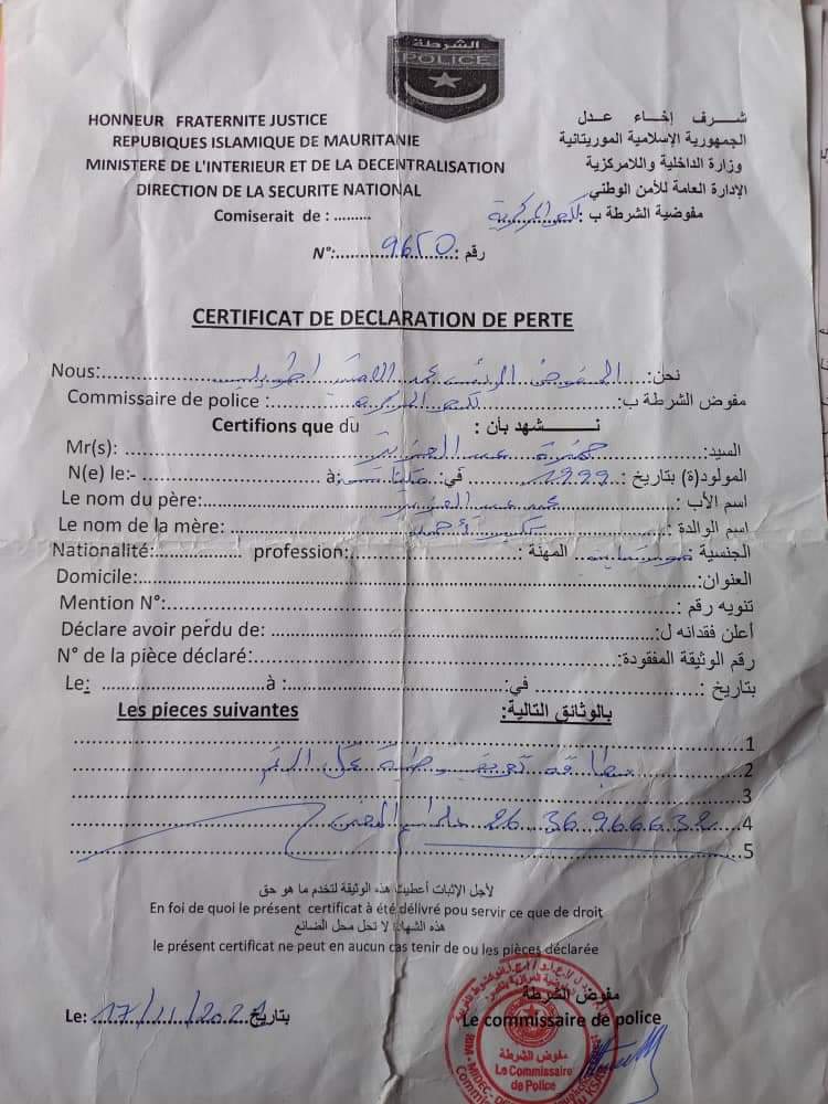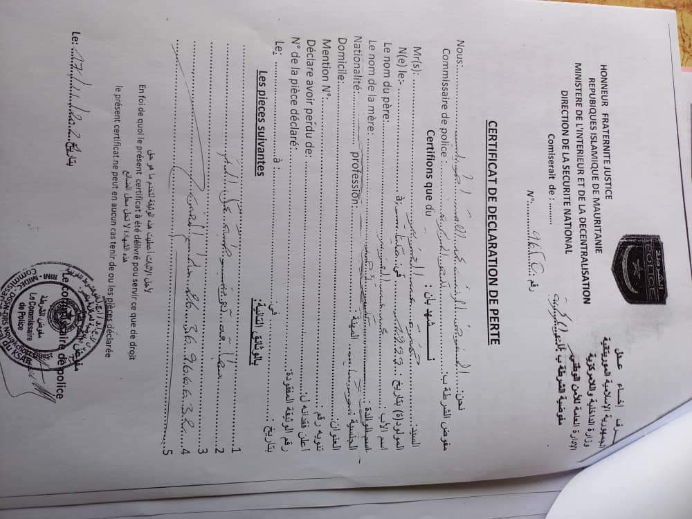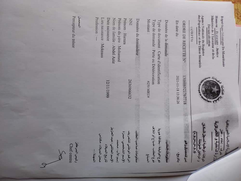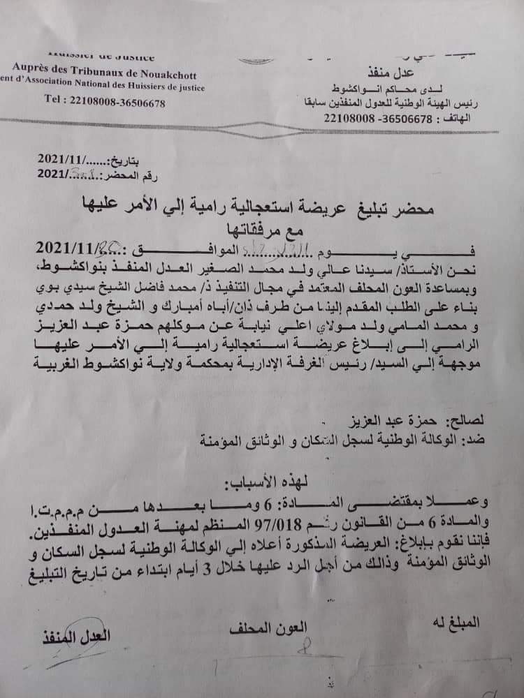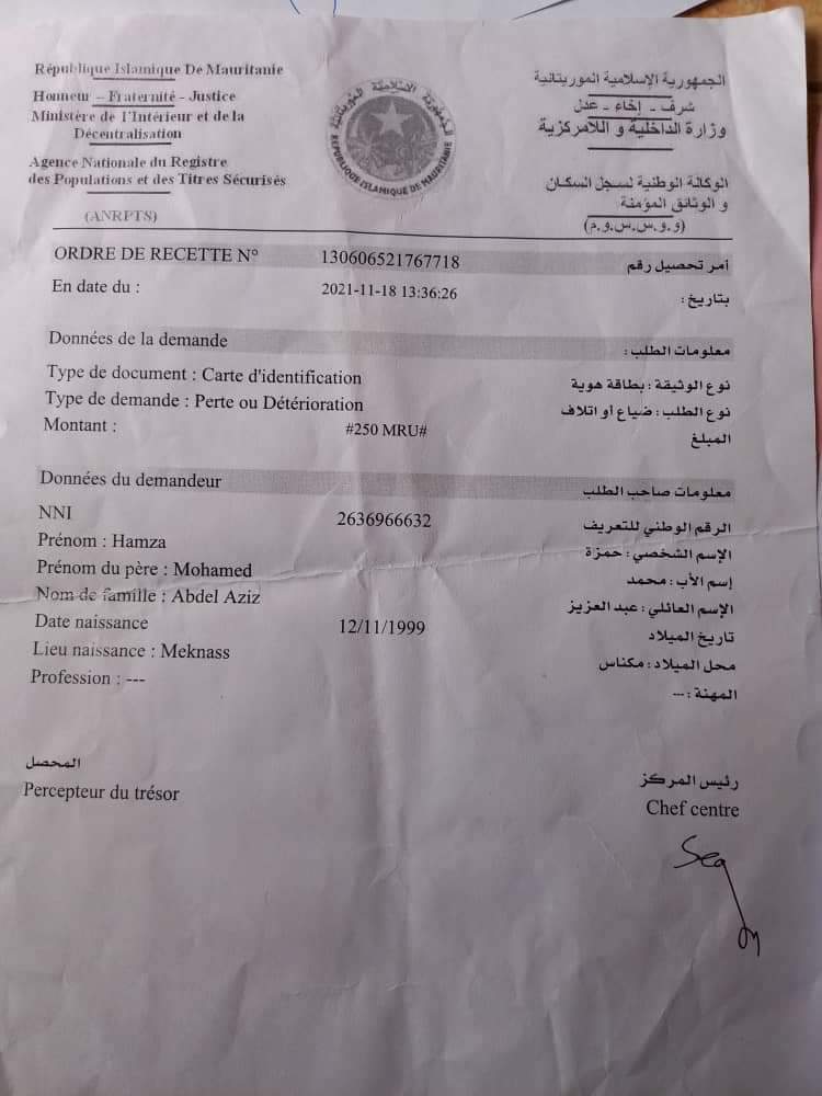 بنشاب : عطفا على بيان الوكالة الوطنية لسجل السكان و الوثائق المؤمنة، المعنون ب:"حق الرد" على منشوري الذي تحدث عن منع الوكالة لعائلة الرئيس السابق من استخراج بعض أوراقهم الثبوتية، البيان الذي فند كل ما جاء في المنشور، فإنني أقدم ردا و بالوثائق على الفقرة التي تحدثت عن عدم تقدم حمزة ولد عبد العزيز ابن الرئيس السابق بطلب لدى المؤسسة للحصول على بطاقة تعريفه، و الحقيقة جلية تبينها الأوراق، فالمعني تقدم بطلب عبر محاميه مرفوقا بشهادة ضياع موثقة عند مفوضية الشرطة بالإضافة إلى وصل مخالصة دفع خلالها الرسوم لدى شباك الخزينة العامة.