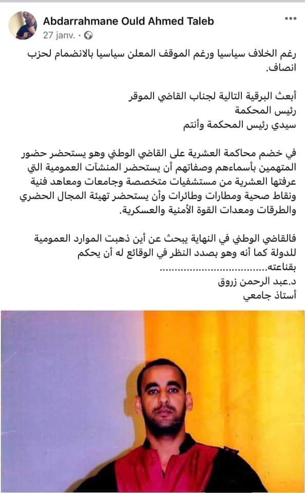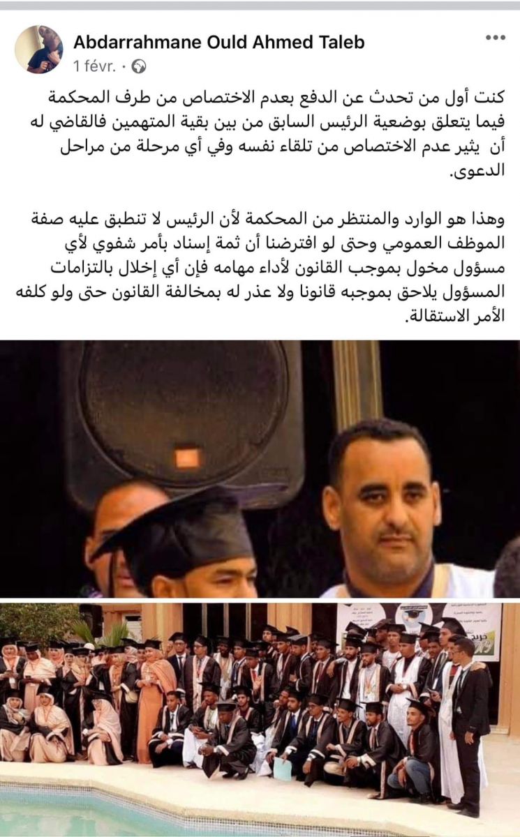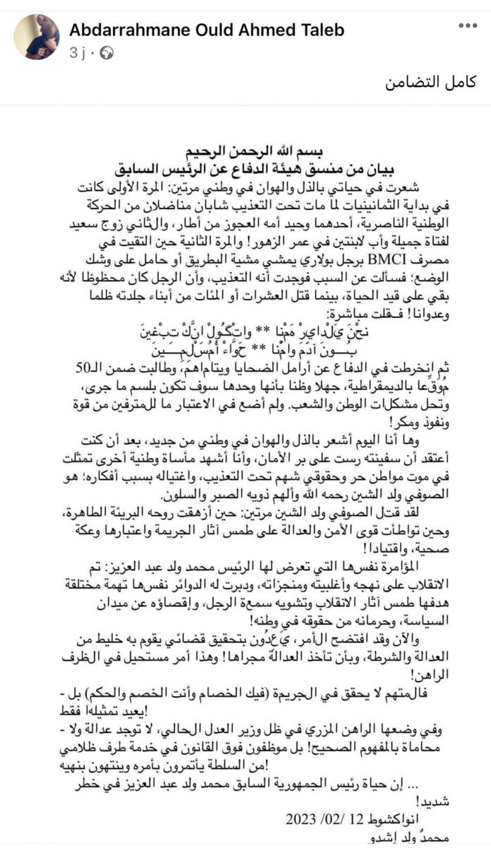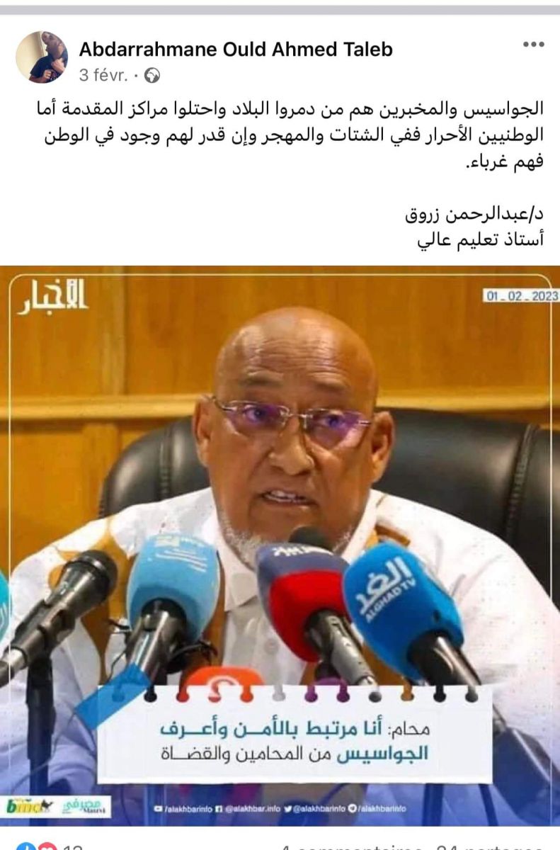 بنشاب : الأستاذ الجامعي الدكتور عبد الرحمن ولد أحمد طالب، داعم لبرنامج الرئيس محمد ولد الغزواني و منتسب لحزب الإنصاف، لكنه يعترض على همجية الاستهداف الذي يتعرض له فخامة الرئيس السابق محمد ولد عبد العزيز،