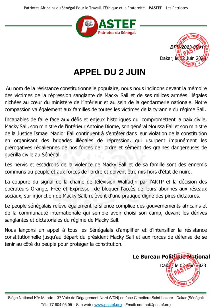 ومن جانبه دعا المكتب السياسي لحزب "الوطنيون من أجل العمل والأخلاق والأخوة" الذي يرأسه سونكو، إلى "توسيع وتكثيف المقاومة الدستورية، إلى غاية رحيل الرئيس ماكي صال".
