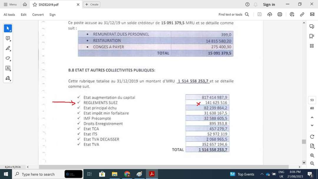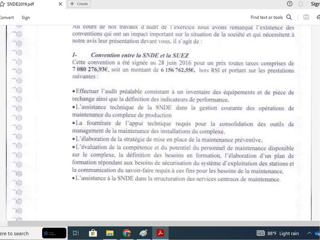 و يشير تقرير SNDE لعام 2019 (الصفحة 9 و 10) أن شركة SNDE كانت تربطها اتفاقية منذ 2016 مع شركة Suez الفرنسية لتقديم خدمات منها الدعم الفني لصيانة منشات انتاج المياه و الصيانة الاستباقية لمجمع انتاج افطوط الساحلي و يشير التقرير ان الشركة الفرنسية تقاضت اتعابها -كاملة و زيادة – بموجب العقد و التي تناهز 7 ملايين اورو !! و هو ما يعني انها اكملت العمل الموكل اليها (الدعم الفني في مجال الصيانة).