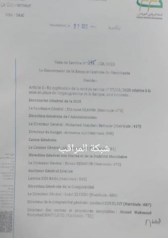 بنشاب : اصدر محافظ البنك المركزي الموريتاني السيد محمد الأمين الذهبي ،مذكرة عمل بموجبها تم تعيين عدد من اطر البنك في مسؤوليات جديدة،وذلك على المستوى المركزي بنواكشوط وادارة انواذيب ،وقد جاءت كالتالي: