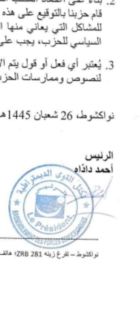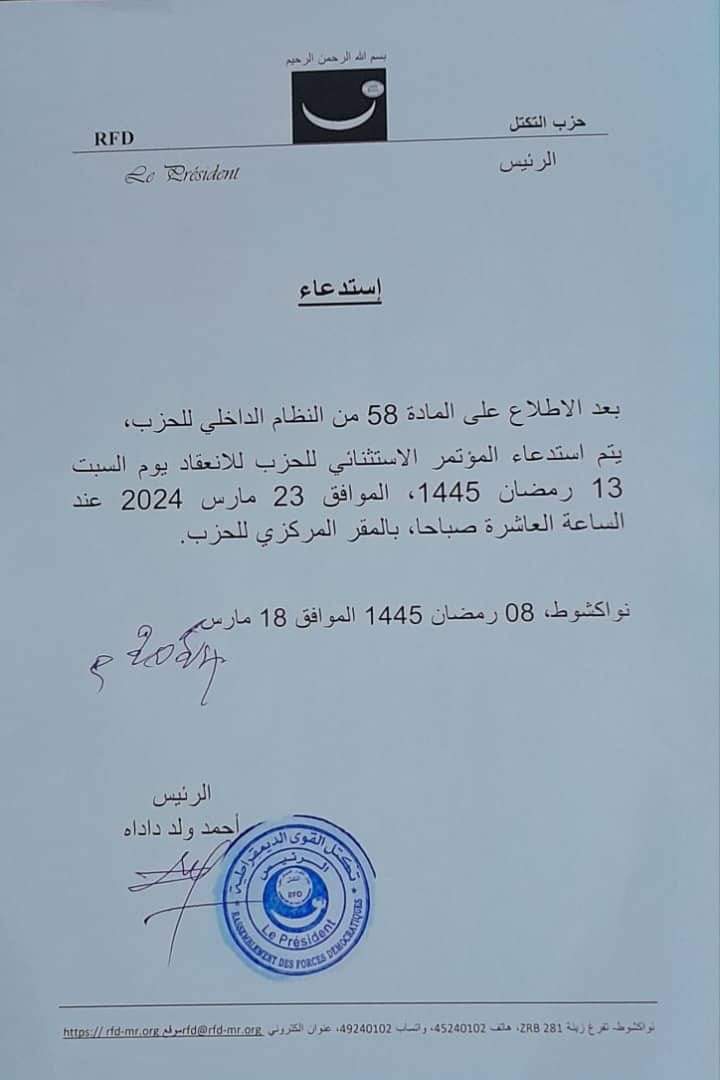 طالعنا قبل قليل قرارا تمت نسبته زورا للرئيس أحمد ولد داداه، يتضمن تأجيلا للمؤتمر الاستثنائي الذي دعا له الرئيس يوم السبت المقبل.