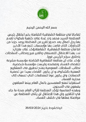 أصدرت منظمة الشفافية الشاملة التي يرأسها عضو مجلس الشيوخ السابق محمد ولد غده بيانا صحفيا حول إحالة رئيسها للسجن مساء أمس الثلاثاء.