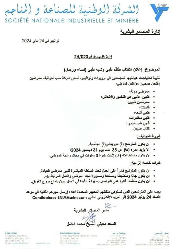 لتلبية احتياجات عيادتيها المجمعتين في ازويرات ونواذيبو، تسعى شركة سنيم لتوظيف ممرضين وفنيين صحيين مؤهلين كما يلي: