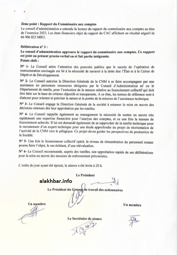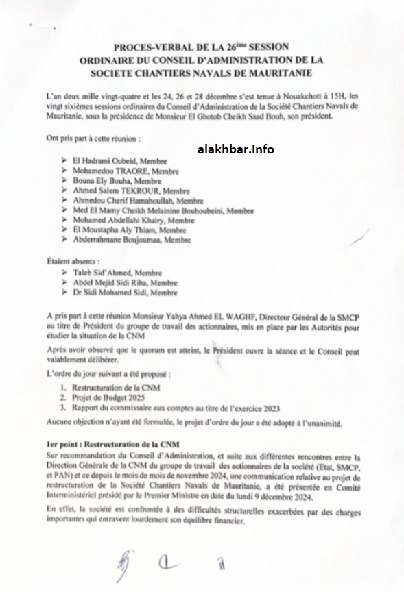 وحضر اجتماع مجلس إدارة الشركة - الذي يرأسه القطب ولد الشيخ سعد بوه - المدير العام للشركة الموريتانية لتسويق الأسماك يحي ولد أحمد الوقف، وهو رئيس مجموعة عمل المساهمين، التي كلفت من السلطات بدراسة وضعية الشركة.