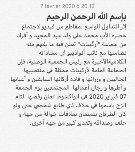 وقال البيان إن الموقف أتخذ بعد تداول مقطع فيديو يظهر فيه محمد عالى ولد عبد المجيد ، وأفراد من جماعة أرقيبات يعلنون فيه ما يفهم منه تضامن القبيلة مع نائب نواذيبو فى مشاداته الأخيرة مع رئيس الجمعية الوطنية.