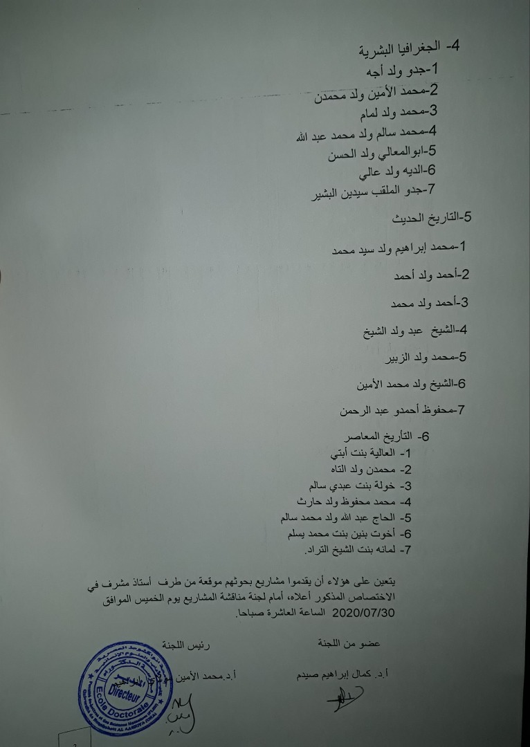 عقدت اللجنة العلمية للدكتوراه في الآداب بجامعة نواكشوط العصرية اجتماعا أمس الإثنين أقرت فيه استكمال لائحة الناجحين باكتتاب سبعة طلاب حسب الترتيب. وأقرت اللجنة أن يكون ثمة سبعة طلاب من كل شعبة. وهذه قائمة الأسماء: لجنةالدكتوراهتقرالناجحين