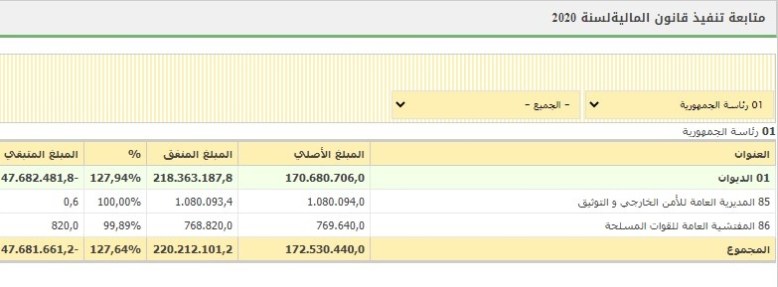 *المرتبة الثانية: الرئاسة التي أنفقت مبلغ 220.212.101,2 من ميزانيتها للعام 2020 البالغة 172.530.440,0 أي نسبة 127,64%.