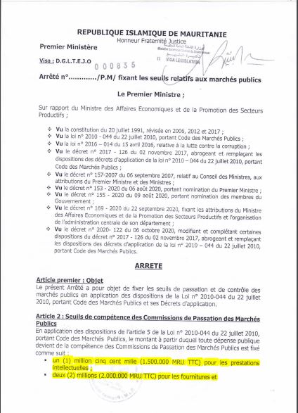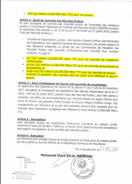 فيما يعود آخر مرسوم يحدد سقف المبالغ لشهر أكتوبر الماضي، حيث وقع الوزير الأول محمد ولد بلال يوم 23 أكتوبر 2020 مرسوما حمل الرقم: 00835، وحدد فيه سقف صفقات الدراسات بـ15 مليون أوقية قديمة، وصفقات التوريد بـ20 مليون أوقية قديمة، وصفقات الأشغال بـ30 مليون أوقية قديمة.