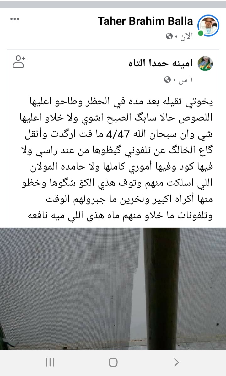 (يخوتي ثقيله بعد مده في الحظر وطاحو اعليها اللصوص حالا سابگ الصبح اشوي ولا خلاو اعليها شي وان سبحان الله 4/47 ما فت ارگدت وأثقل گاع الخالگ عن تلفوني گبظوها من عند راسي ولا فيها كود وفيها أموري كاملها ولا حامده المولان اللي اسلكت منهم وتوف هذي الكوّ شگوها وخظو منها أكراه اكبير ولخرين ما جبرولهم الوقت وتلفونات ما خلاو منهم ماه هذي اللي ميه نافع)...